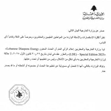 أعلنت وزارة الخارجية والمغتربين في لبنان أن الحدث المعنون «Lebanese Diaspora Energy (LDE) – Special Edition 2025» لا يمتّ بصلة إلى الوزارة بأي شكلٍ من الأشكال، وليس من تنظيمها أو تحت رعايتها.